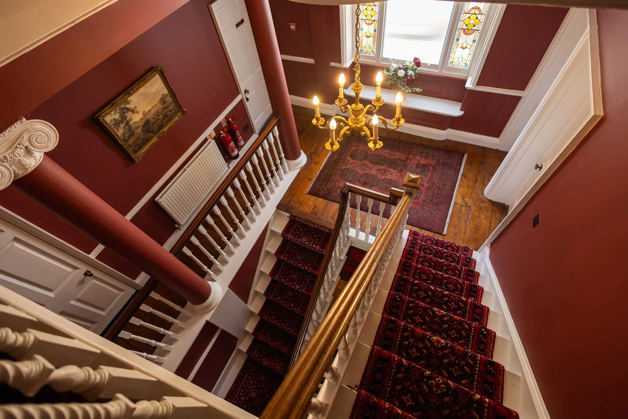 Inside, a grand staircase leads to beautifully designed rooms that blend traditional charm with contemporary style. From double rooms to spacious suites, each space is thoughtfully furnished with a mix of eclectic pieces, luxurious throws, and soft cushions. Bathrooms feature oversized walk-in showers, rain showerheads, and, in some rooms, indulgent bathtubs. White, fluffy towels and premium toiletries add to the comfort, while our 400-thread-count Egyptian cotton bedding and goose-down pillows ensure a restful night.